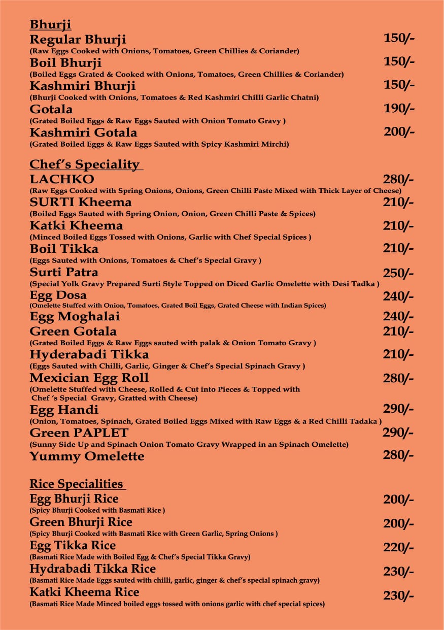 Taking a look on fusion of cuisines our dishes such as Egg Dosa which is popularly attracted the crowds and Mexican Egg Roll and Surti Patra.The Famous Egg dosa is delectable Fusion of omelette and dosa with omelette stuffed with a scrumptious, luscious filling of grated cheese and veggies chopped onions, tomatoes, spring onions and fresh spices and herbs.The well accepted Mexican egg roll is consists of thick onion gravy prepared with chopped onions, tomatoes, grated cheese and chef's special spices. With omelette stuffed with grated cheese rolled and cut into pieces and topped with this specially made gravy and grated cheese as garnish.Adding a surati touch on egg variations is Surti Patra which is prepared by using raw eggs, butter tossed with Chef's exquisite Surti style prepared gravy. made of omelette, egg yolks and some seasoning and garnish of grated cheese.